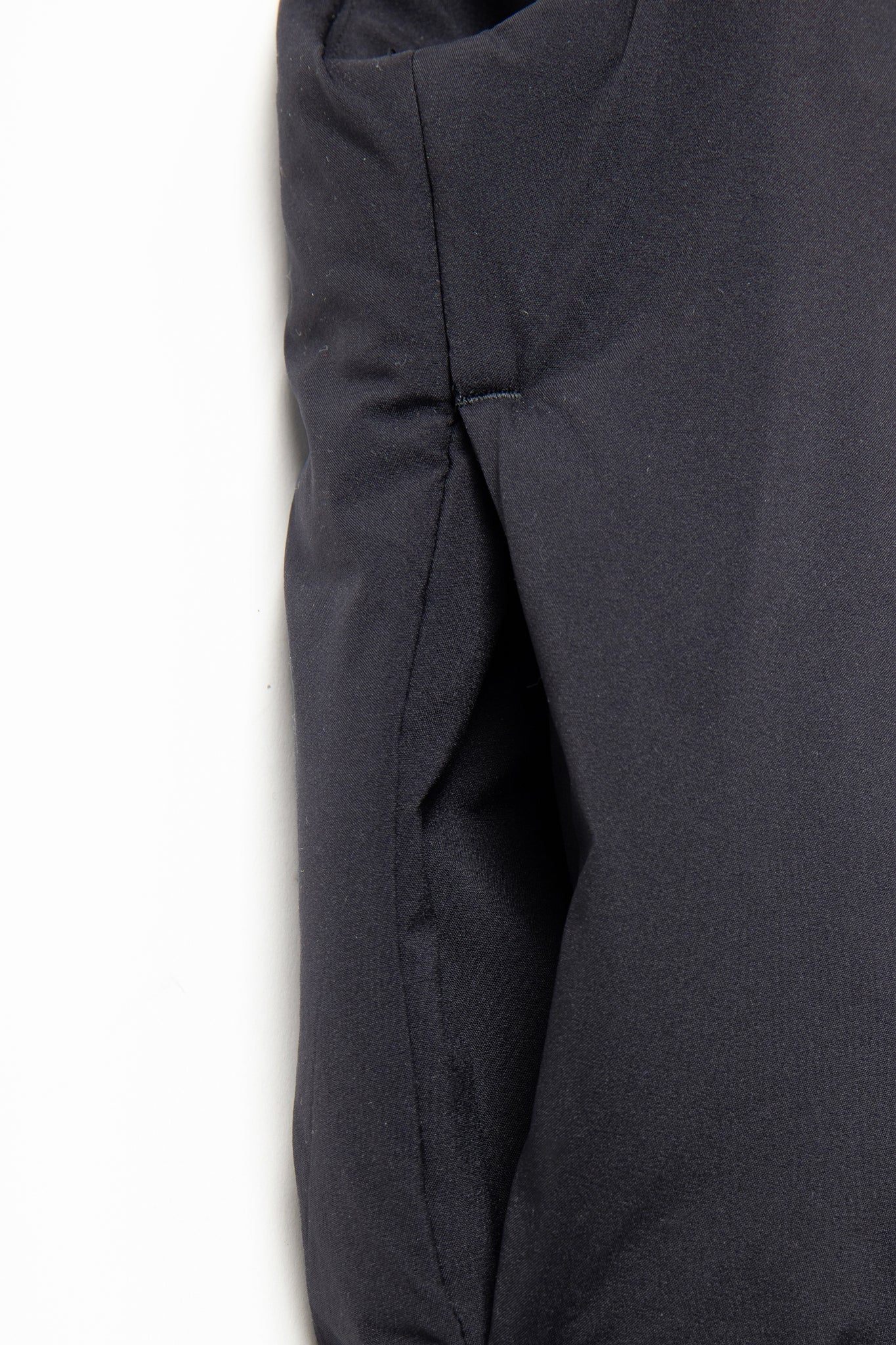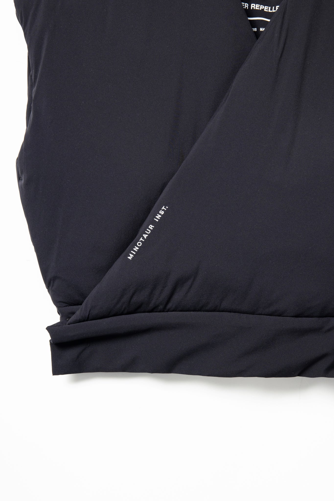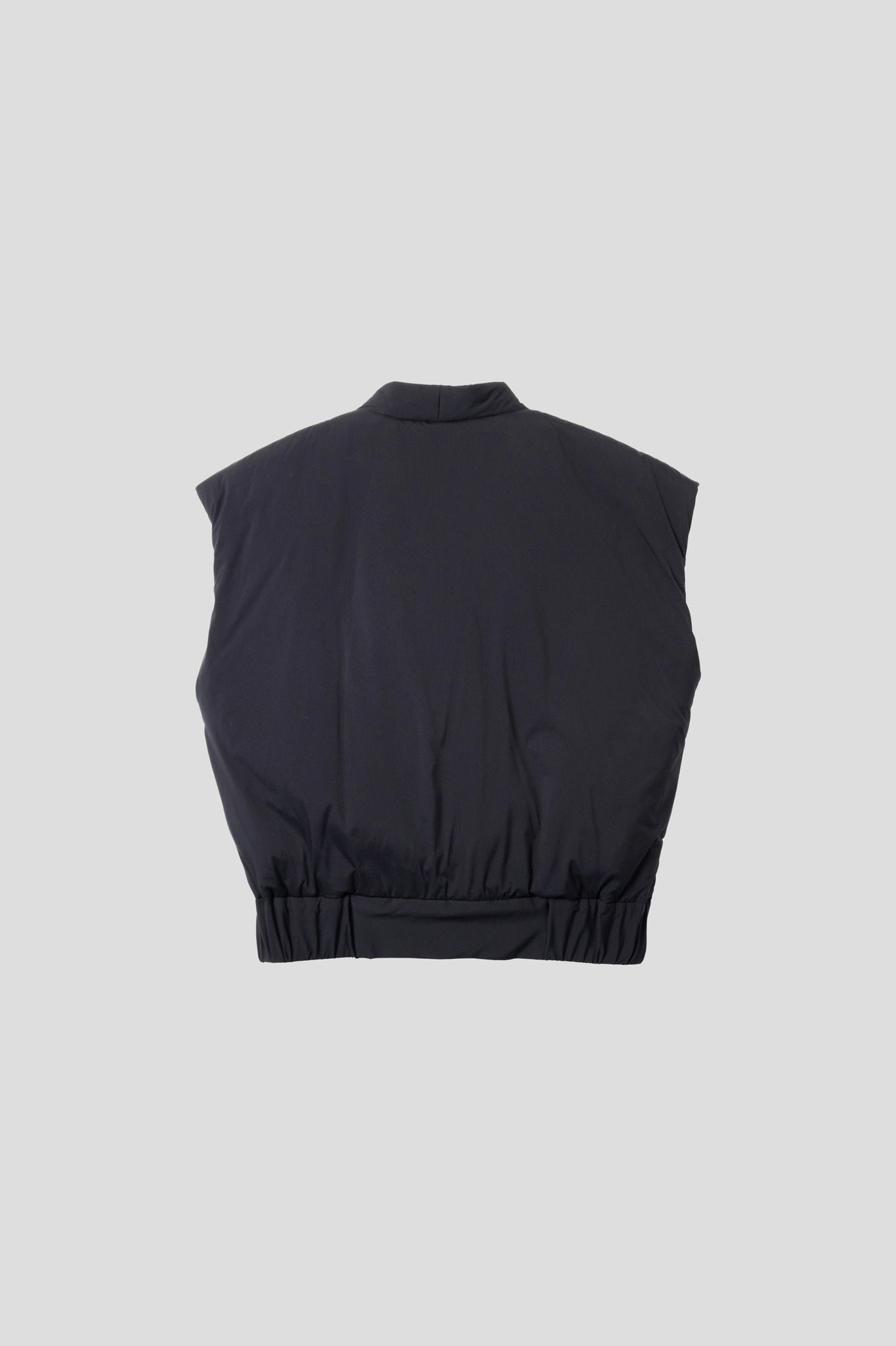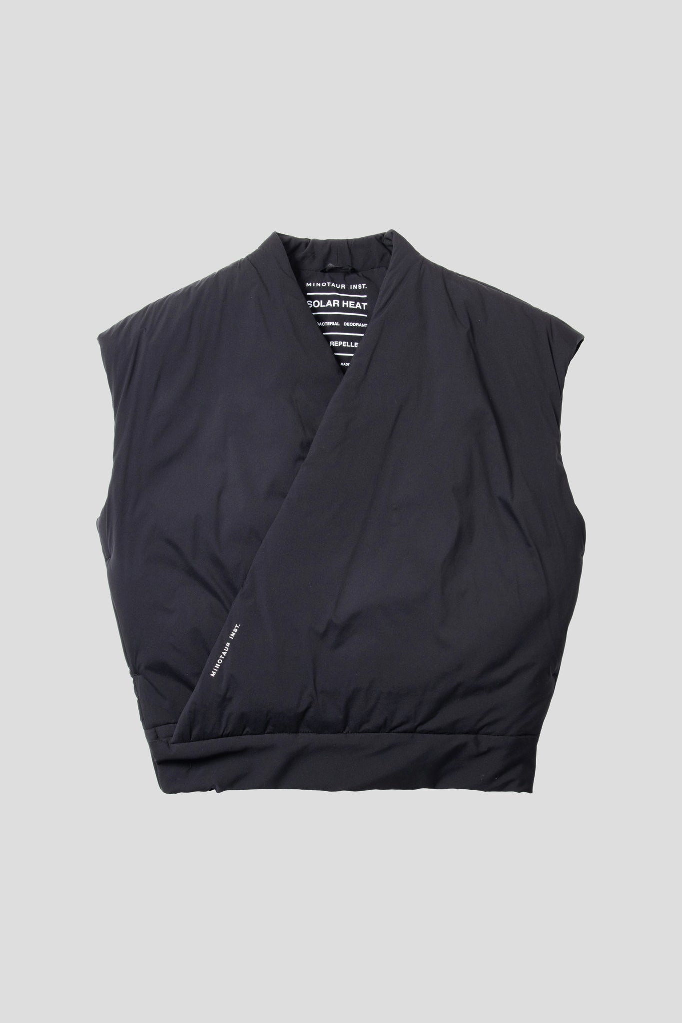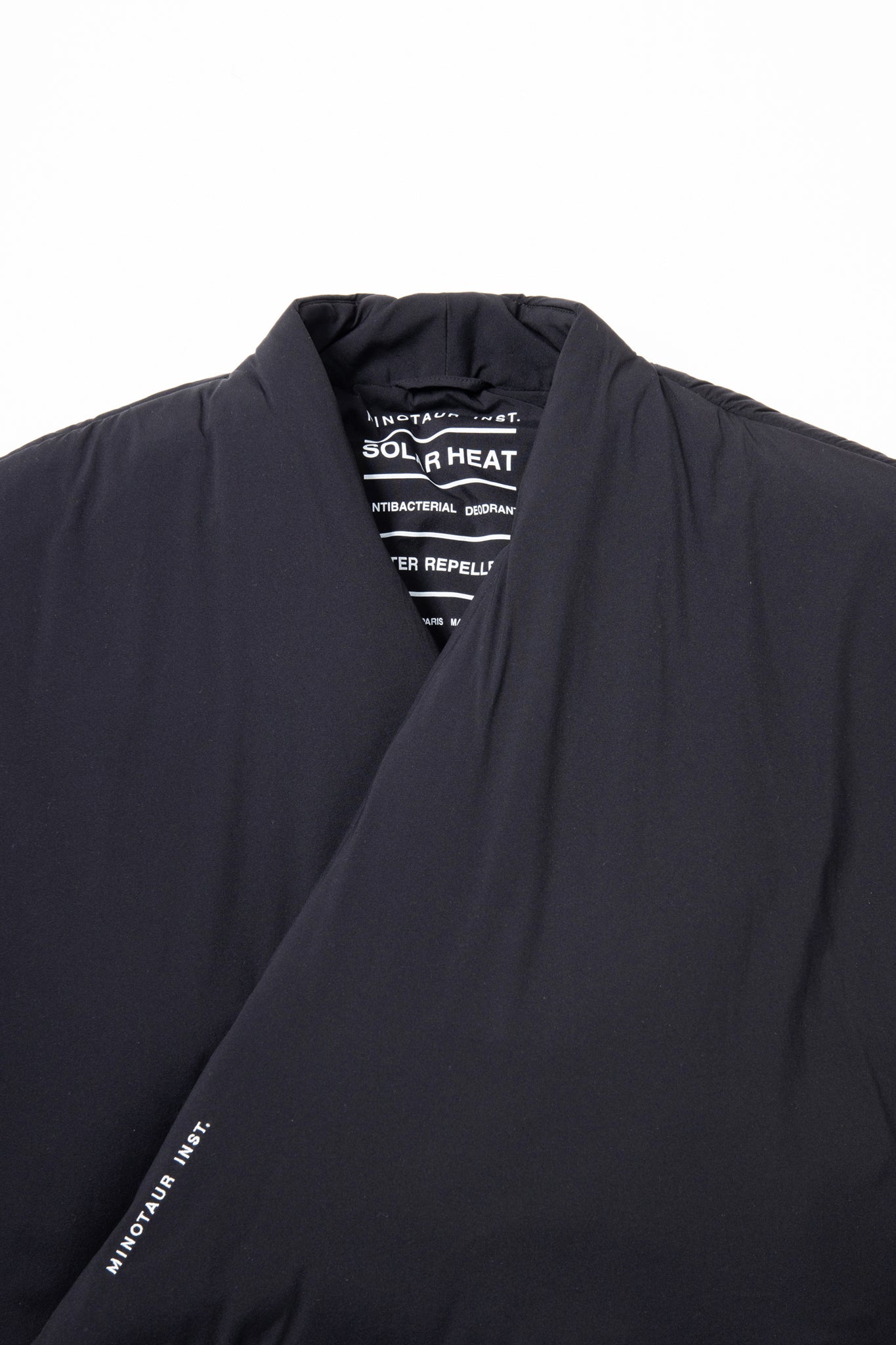 着物から着想を得たややダウンショルダーの薄手中綿ベスト。