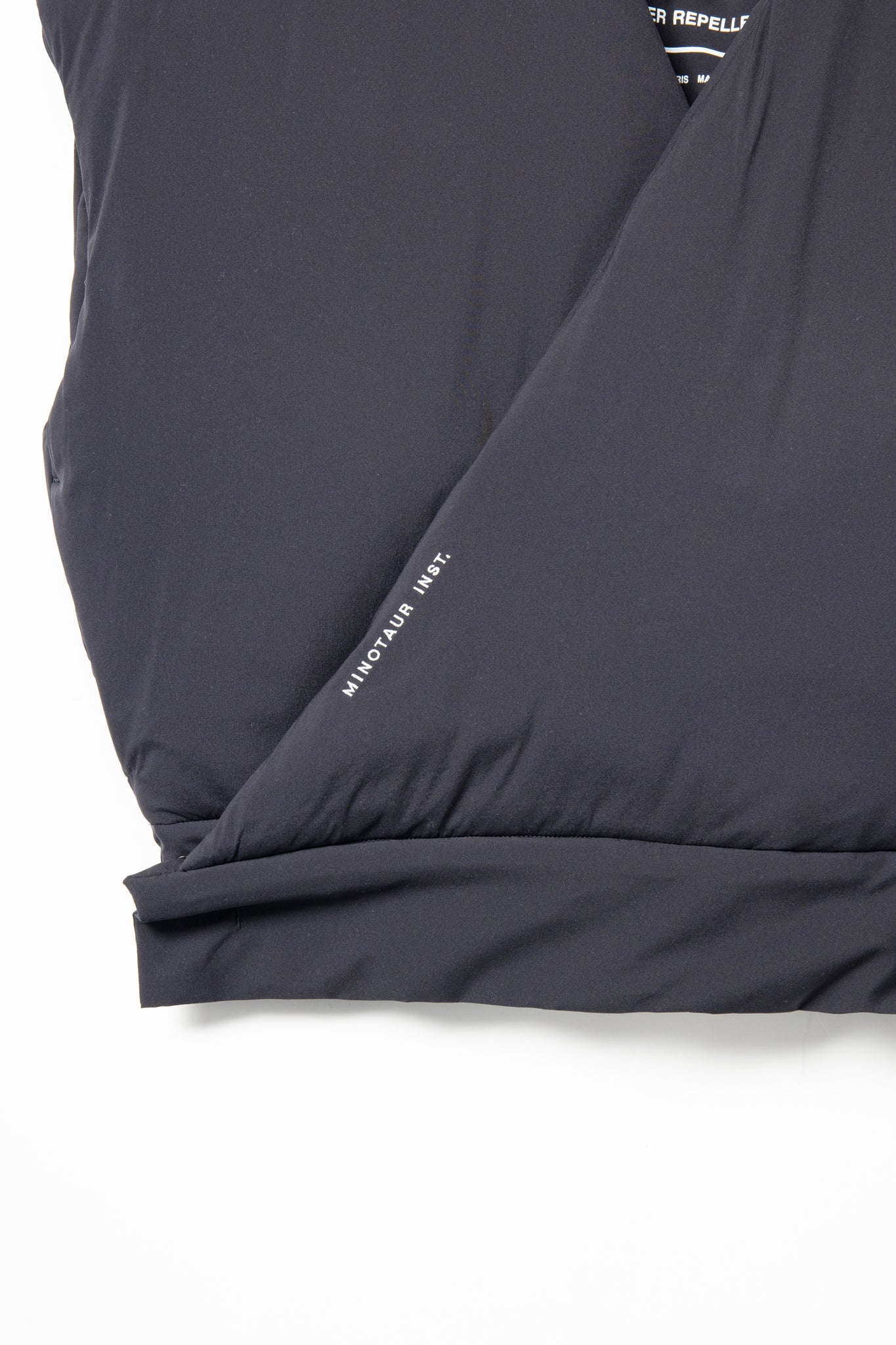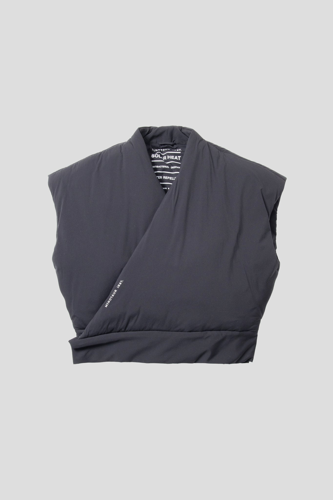 着物から着想を得たややダウンショルダーの薄手中綿ベスト。
