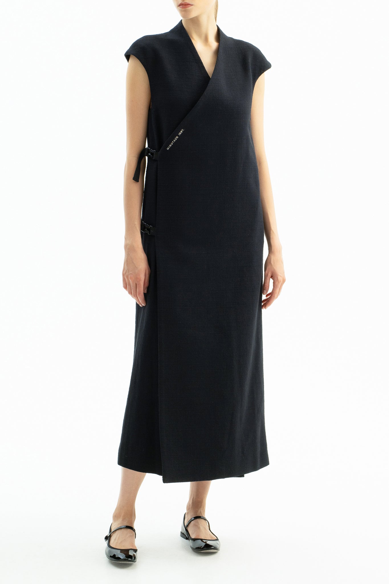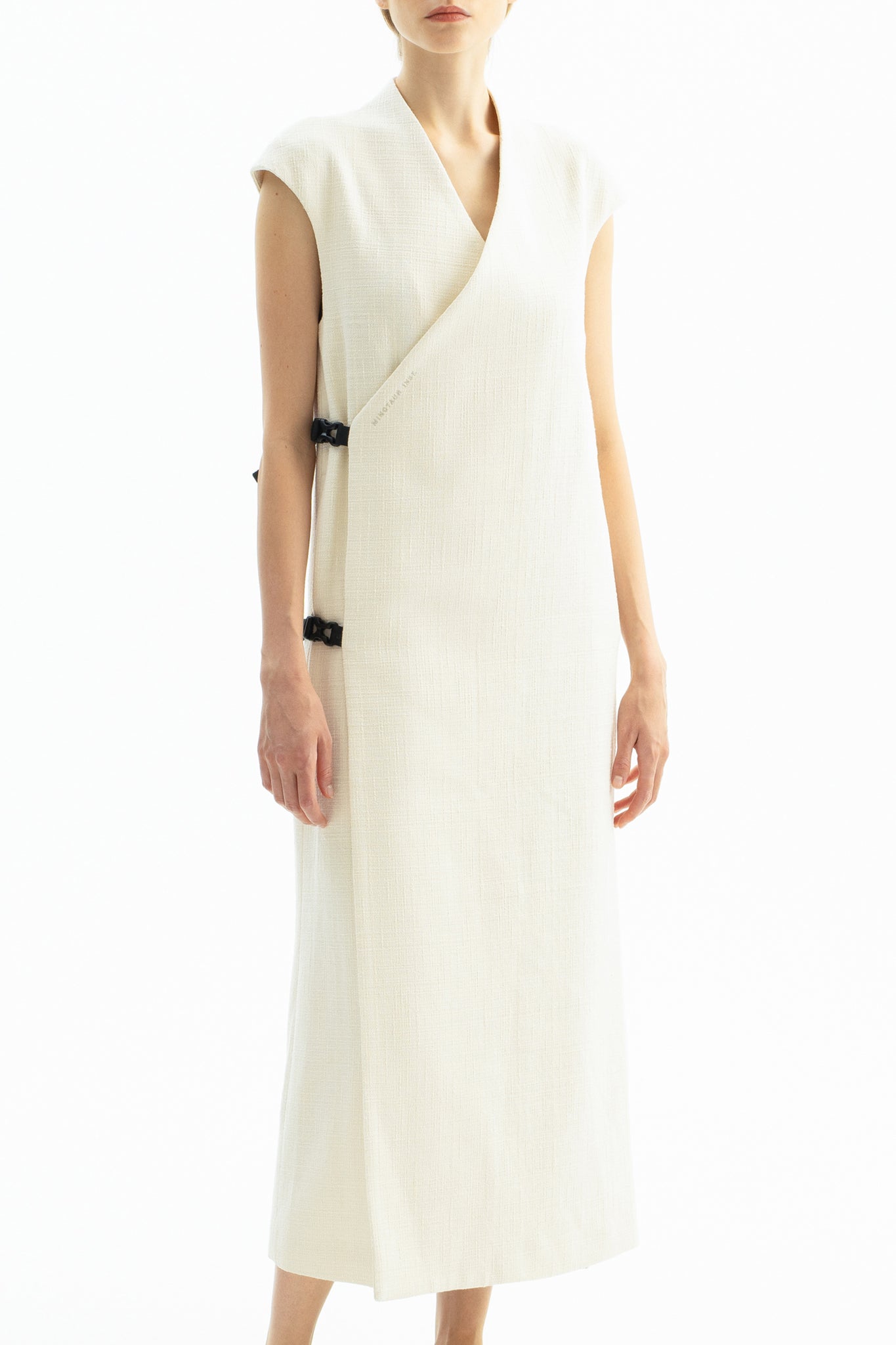 ややダウンショルダーのフレンチスリーブラップドレスは、着物の雰囲気も併せ持つモダンなデザイン。